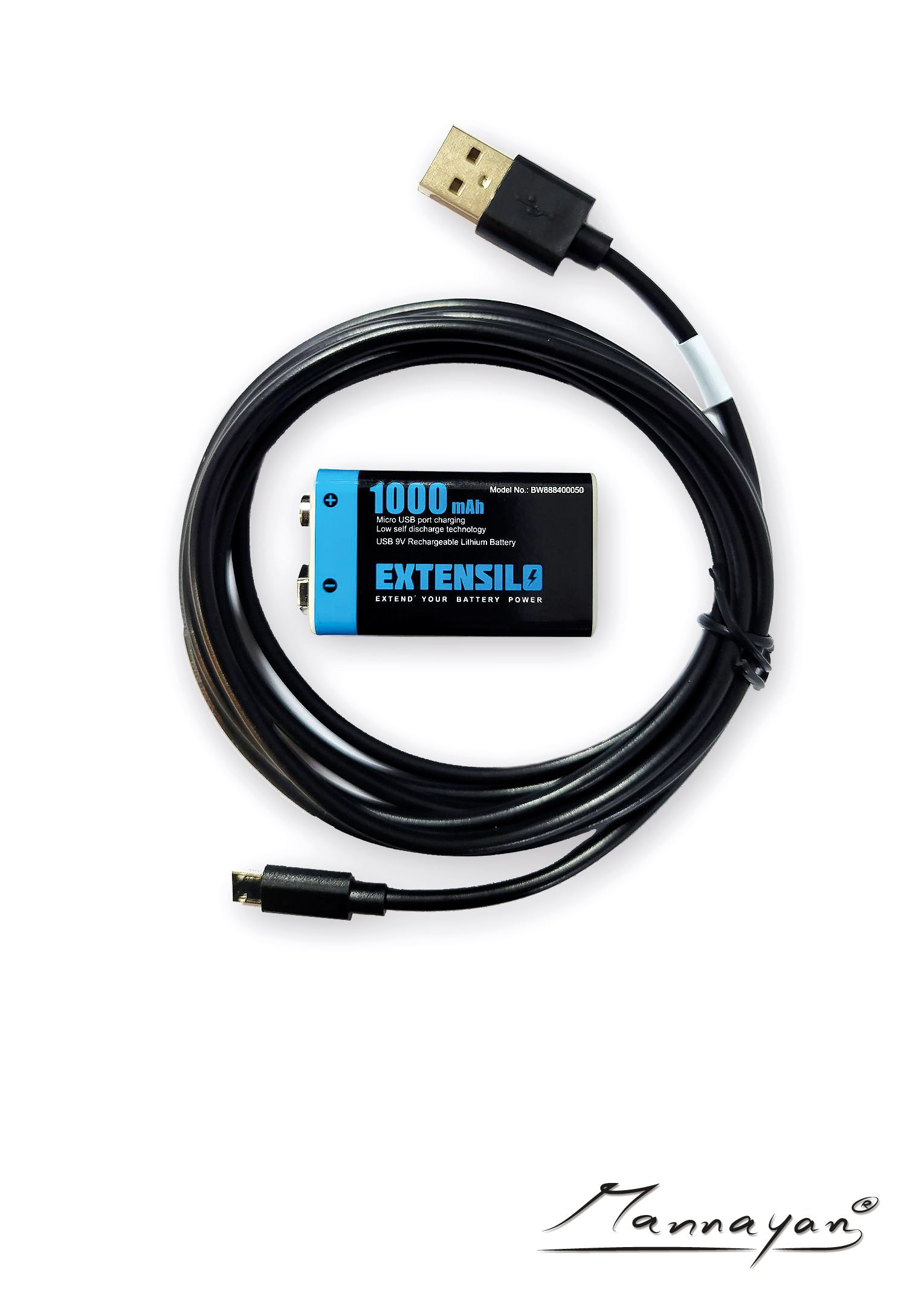 9-volt lithium-ion battery + USB charging cable.